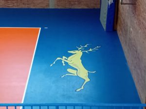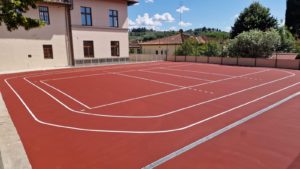 Riqualificazione di un piazzale della scuola, andato a realizzare un nuovo campo polifunzionale (pallavolo e corsa) in resina di colore rosso. rimaniamoIn contatto