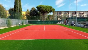 Trasformazione di 2 campi da tennis in erba sintetica, rimuovendo il vecchio manto e installando un nuovo manto in erba sintetica bicolore (rosso e verde)