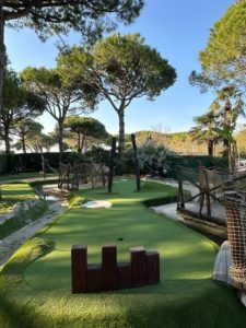 Sistemazione di un’area con 18 buche da mini-golf, andando a sostituire la vecchia pavimentazione in moquette e installando un nuovo manto in erba sintetica specifico